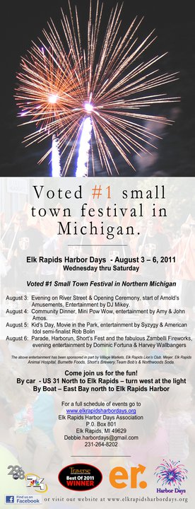 Photo Gallery Some moments are worth revisiting. Browse years of Elk Rapids Harbor Days photos, soak in the nostalgia, and follow us on Facebook and Instagram to stay connected and up to date! 2015 2014 2013 2012 2011 2008 EVENT DATES August 5-8, 2026 LOCATION Elk Rapids, Michigan Mail to: PO Box 801, Elk Rapids, MI 49629 EMAIL info@ElkRapidsHarborDays.org Site Map HomeAbout the FestivalBecome a SponsorButton Design ContestCar ShowsContact UsEvent CalendarForms & ApplicationsFriends of Elk Rapids Harbor DaysHistory of Harbor DaysSponsorsVolunteer Send a message Name Email Address Message 10 + 2 = Submit